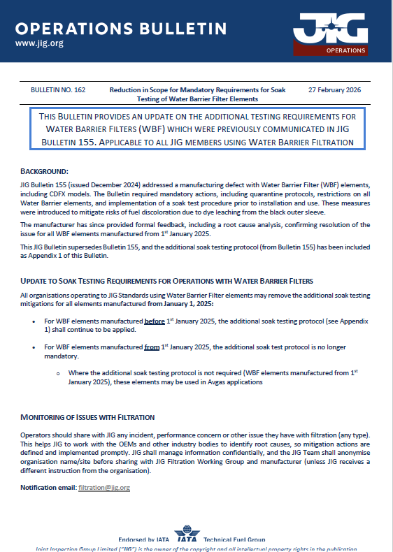 This Bulletin provides an update on the additional testing requirements for Water Barrier Filters (WBF) which were previously communicated in JIG Bulletin 155. Applicable to all JIG members using Water Barrier Filtration